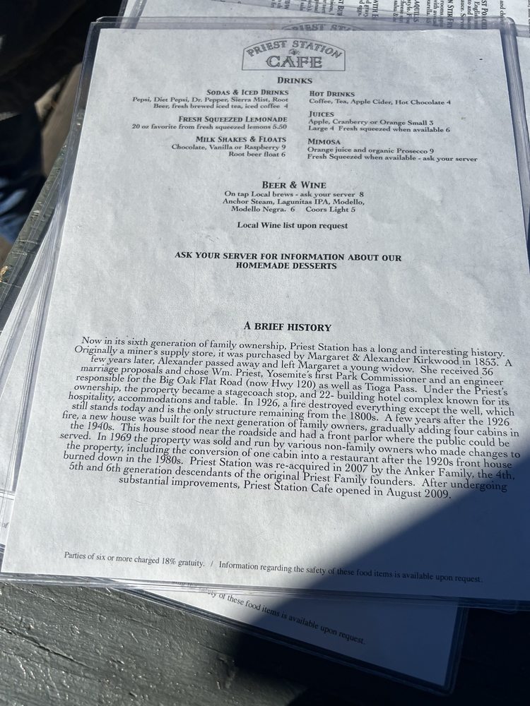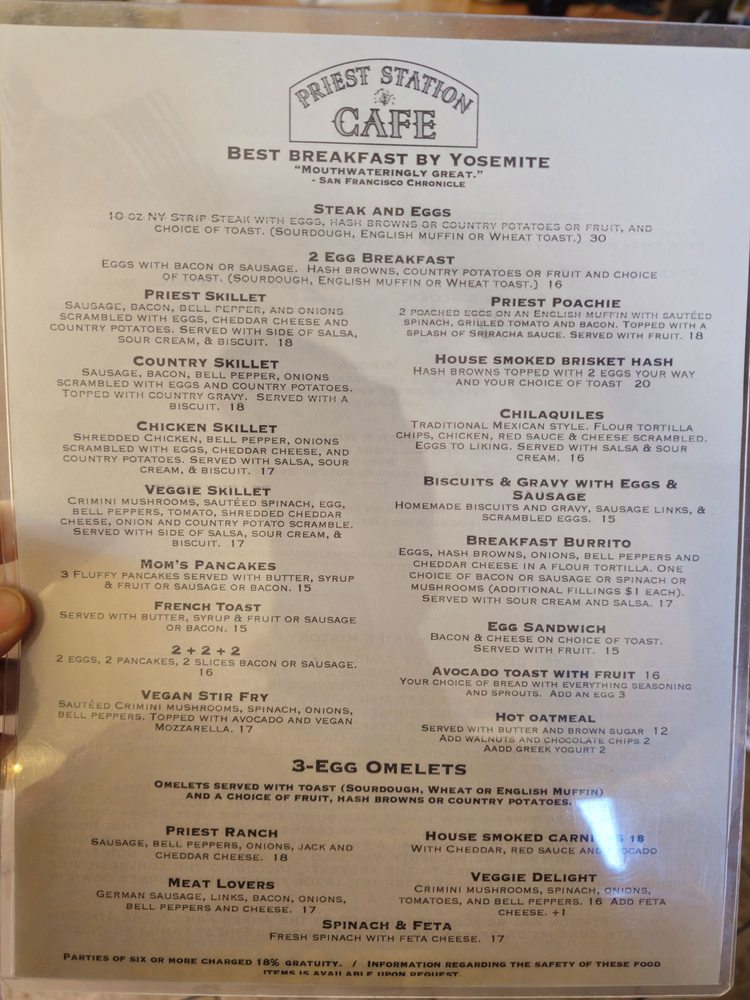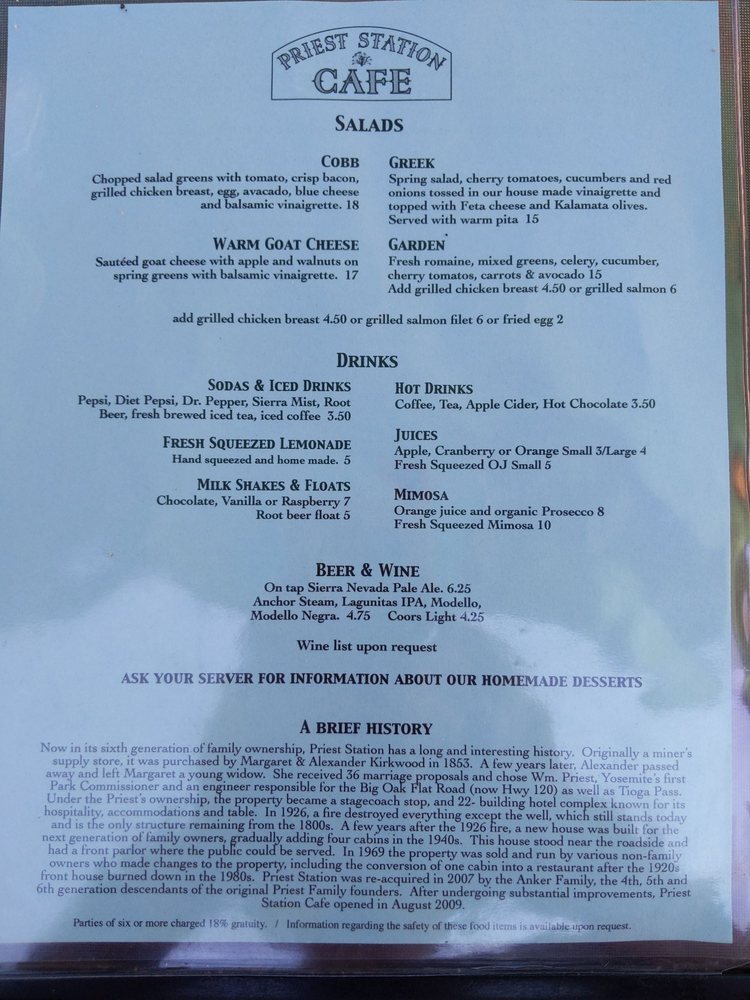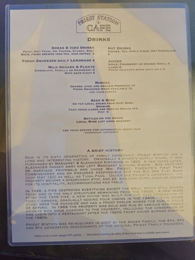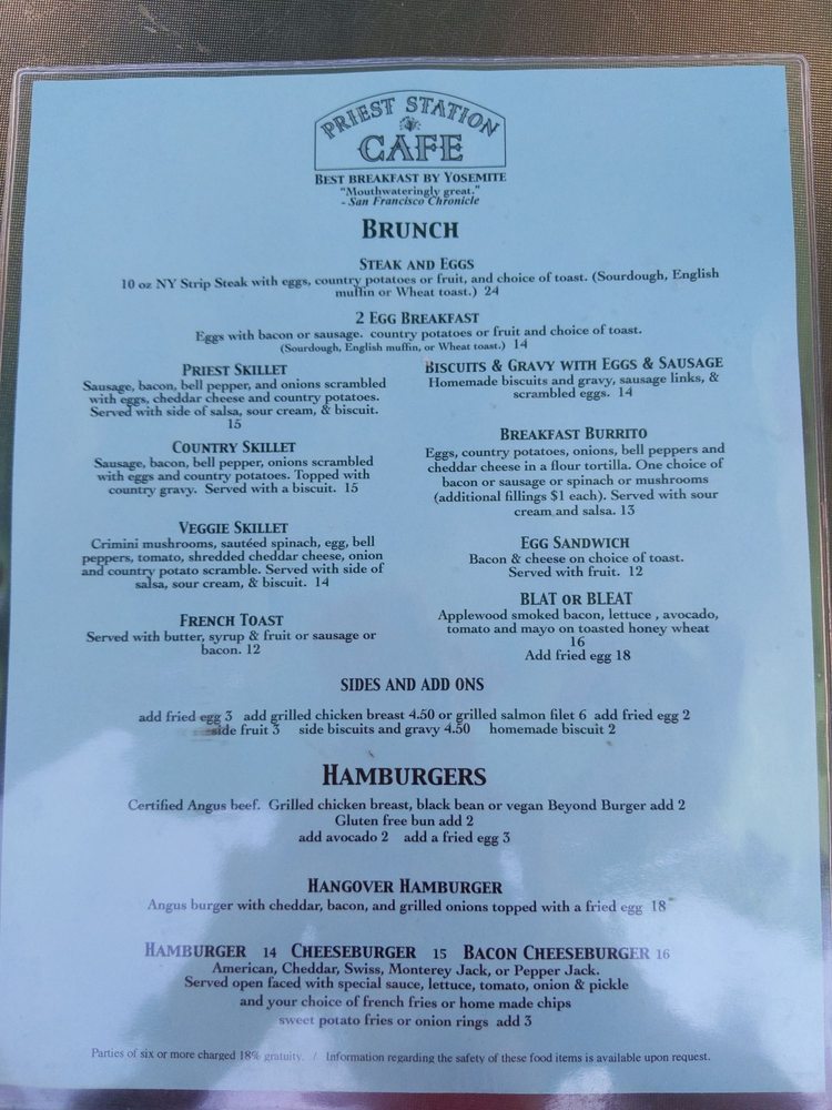 Introducing the menu at Priest Station Cafe, a hidden gem located in Big Oak Flat, CA. This American Breakfast & Brunch spot offers a wide range of options including vegan and vegetarian choices. From "Priest au Poivre" and "Cowboy" burgers to "Sassy Brisket" and German Bratwurst, each dish is crafted with care. Customers rave about the fast and attentive service, affordable prices, and stunning mountain views. Whether you're stopping by for breakfast, lunch, or dinner, Priest Station Cafe has something for everyone. The staff is welcoming, the outdoor seating is cozy, and the food is simply delicious. Don't miss out on this charming spot along your journey to Yosemite National Park.